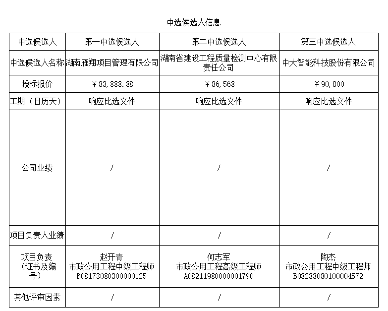 植物園片區(qū)雁云路(幸福河街-紅峰路段)項(xiàng)目檢測(cè)單位咨詢服務(wù)比選于2025年08月21日15時(shí)00分在衡陽(yáng)國(guó)投4棟3樓評(píng)標(biāo)室進(jìn)行了比選開(kāi)標(biāo)、評(píng)標(biāo)活動(dòng),評(píng)標(biāo)委員會(huì)按照比選文件及相關(guān)法律法規(guī)規(guī)定進(jìn)行評(píng)審,推薦以下三名中選候選人(排序),現(xiàn)將相關(guān)信息予以公示。
