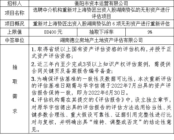 選聘中介機(jī)構(gòu)重新對(duì)上海贄匠出資入股湖南贄弘的無(wú)形資產(chǎn)進(jìn)行評(píng)估項(xiàng)目抽取結(jié)果公示